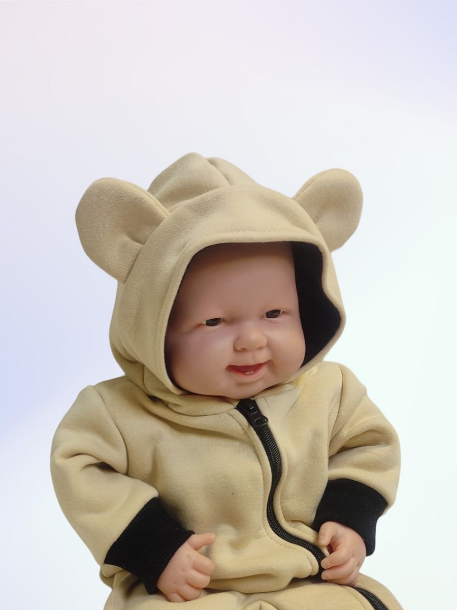 Комбинезон выполнен из футера двухнитки с начёсом. Спереди косая молния, капюшон на подкладке. У комбинезона закрытые ножки, на рукавах манжеты.